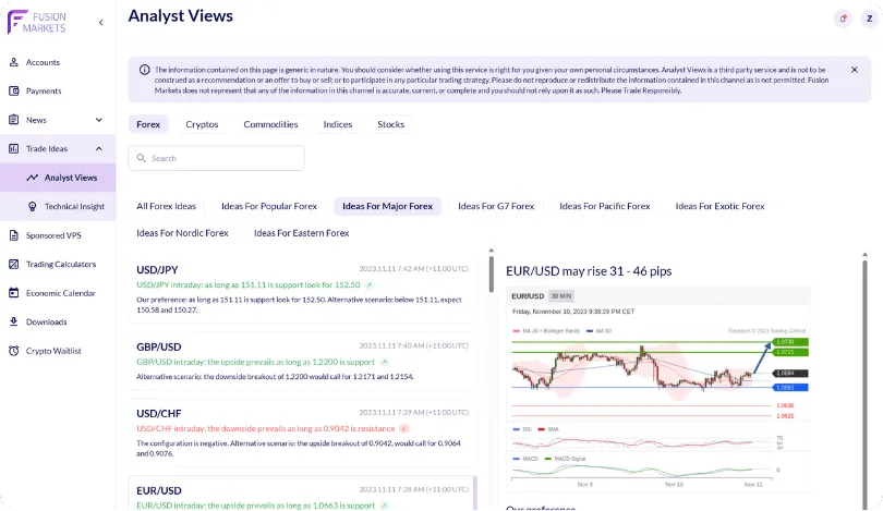 With analyst views, you can get a quick, actionable view on the market covering all of Fusion Markets’ suite of products including Forex, Commodities, Shares and Indices.